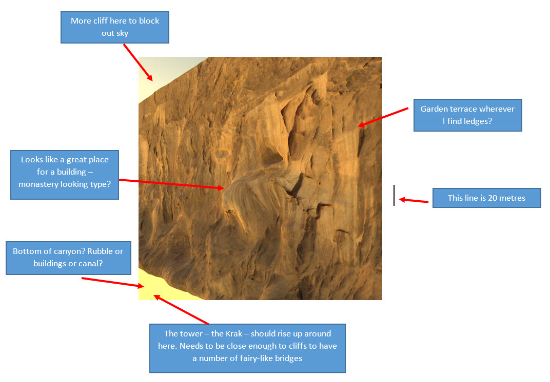 So I did a bit of research into mountain monasteries to get an idea for my cliff city. Lots of pictures available on Google images. Then I went and made the cliffs look a bit bulkier and substantial in Blender (more ledges etc.). I felt that this would add reality.